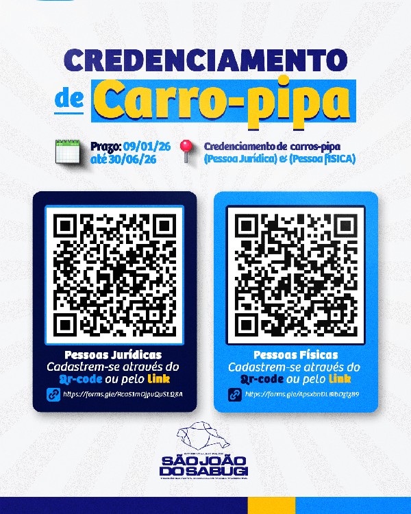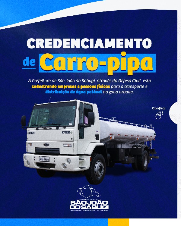 A Prefeitura Municipal de São João do Sabugi, por meio da Defesa Civil, está realizando o credenciamento de empresas e pessoas físicas para o transporte e distribuição de água potável na zona urbana do município.